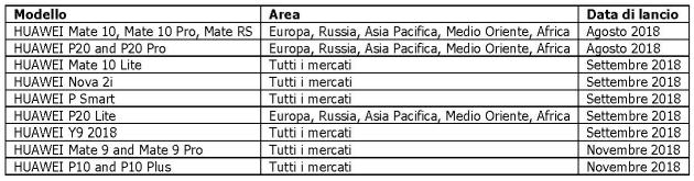 Questo l’elenco degli smartphone che riceveranno l’aggiornamento. I primi sono quelli della serie Huawei Mate 10 e P20. Il rollout terminerà a novembre con la versione per le serie Huawei Mate 9 e P10.