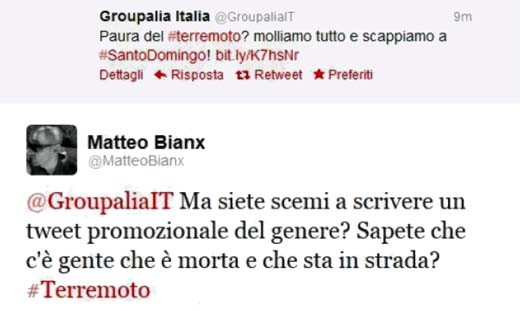 Erano le 10.29 quando l’account della società che si occupa di proposte per il tempo libero (compreso i viaggi) ha postato un tweet che gli americani definirebbero un “banana skin”: «Paura del #terremoto? Molliamo tutto e scappiamo a #SantoDomingo!». Era passata un’ora e mezza dalla scossa che ha fatto tremare tutto il Nord Italia. È bastata una risposta di un utente, MatteoBianx, per scatenare, tramite i re-tweet, una vera ondata di sdegno che ha prodotto un hashtag, #defollowgroupalia col quale la comunità dei 140 caratteri ha puntato il dito contro l’azienda e il suo stile di marketing evidentemente poco rispettoso (o quanto meno poco attento) del dolore delle vittime del sisma.