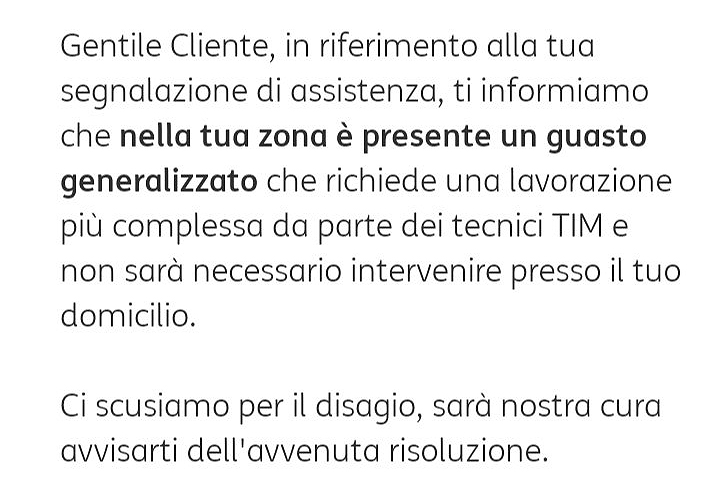 Non è chiaro al momento cosa abbia causato questi problemi, ma solo che il fenomeno è a conoscenza di TIM che sta operando per la risoluzione del problema. L’operatore non ha rilasciato nessuna comunicazione ufficiale in proposito, ma dopo un iniziale down anche del sito di assistenza, lo ha ripristinato e ha cominciato a rispondere ai singoli utenti perfino su Twitter, spiegando che si tratta di un guasto generalizzato al quale, appunto, i tecnici TIM stanno lavorando.