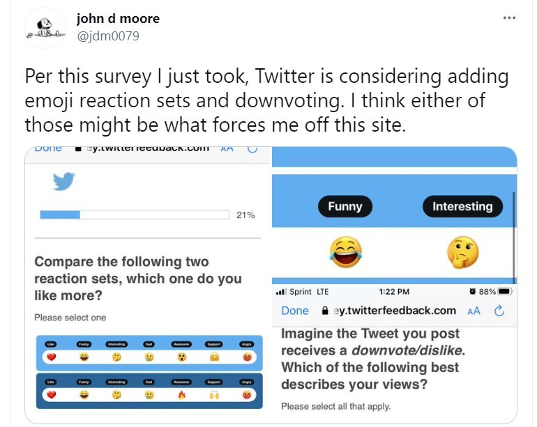 L’azienda di Jack Dorsey sta portando avanti anche dei sondaggi tra i suoi utenti, consapevole delle sfide che derivano dall’introduzione di reazioni emoji che potrebbero implicare sentimenti negativi nei frequentatori del social più sensibili. Da questo punto di vista è stato per esempio chiesto ai partecipanti al test come si sentirebbero se i propri tweet venissero sottovalutati e se ciò li scoraggerebbe dal twittare in futuro, o se invece lo prenderebbero più come un feedback “costruttivo” sui loro contenuti. Ma anche se avessero utilizzato a quel punto più spesso questo sistema anziché magari rispondere con un commento scritto.