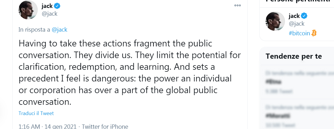 Jack Dorsey, fondatore e proprietario di Twitter, ha affidato a una serie di messaggi sul famoso social, il suo pensiero sulla questione ban di Donald Trump. Da questo punto di vista, il creatore di Twitter e Fleetic ha sostenuto che, seppur ritenendo valide le motivazioni che hanno spinto la sua piattaforma a bandire l’account del presidente americano uscente, considera comunque la decisione un “fallimento” che stabilisce un precedente pericoloso nell’ambito del potere detenuto dalle grandi aziende.