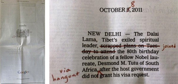 Nell’ottobre dello scorso anno USA Today ha indetto un concorso intitolato Print Advertising Competition 2012, invitando tutte le società attive nel mondo dell’advertising a sottoporre i propri lavori relativi alla pubblicità su quotidiani e riviste cartacee. Il premio, del valore di un milione di dollari, è stato assegnato al team Google Creative Lab, per un’inserzione comparsa in autunno sulle pagine del New York Times.
