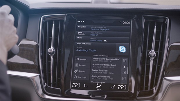 Per lanciare l’applicazione sarà sufficiente un tocco sul grande display touchscreen presente al centro del cruscotto, come si può vedere dal filmato dimostrativo in streaming di seguito, minimizzando così le distrazioni mentre ci si trova al volante. Attraverso l’interfaccia si potranno consultare l’elenco dei meeting in programma e quello dei propri contatti. Non è del tutto chiaro come avverrà la connessione alla Rete, ma si presume sfruttando quella offerta dallo smartphone, mediante hotspot. Così Anders Tylman-Mikiewicz, vicepresidente della divisione Consumer Connectivity Services di Volvo Car Group, commenta l’iniziativa.