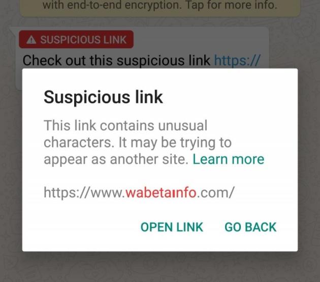 Se l’utente tocca il link verrà mostrato un avvertimento che segnala la presenza di caratteri insoliti nel link. È quindi possibile tornare indietro o aprire il link a proprio rischio. Il controllo del collegamento viene effettuato sullo smartphone (nessun dato è inviato ai server di WhatsApp o Facebook), quindi è probabile che la “black list” sia inclusa nel codice dell’applicazione.