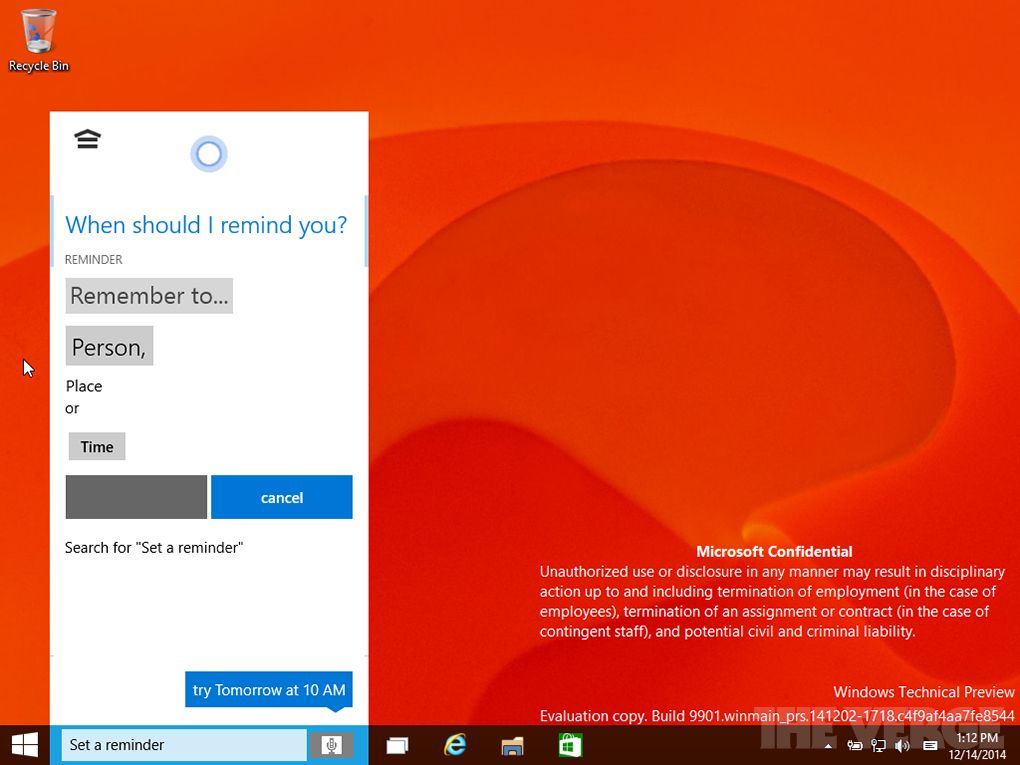 Windows 10 Consumer Preview integrerà Cortana. L’assistente personale aveva già fatto la sua comparsa all’inizio del mese, mostrando una interfaccia provvisoria e alcune funzionalità simili a quelle presenti su Windows Phone 8.1. Nella build 9901 il pulsante che attiva la ricerca, identificato con una lente di ingrandimento, può essere sostituito da un “search box", in cui l’utente digita direttamente le domande. Sarà comunque possibile scegliere una delle due opzioni. Alla destra del campo è visibile l’icona di un microfono per l’attivazione dei comandi vocali. Gli appunti, i promemoria e gli interessi sono accessibili senza passare per l’app Settings.