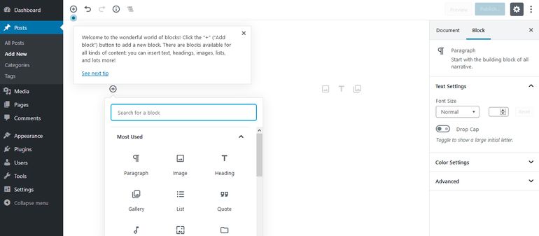 Il nuovo backend era finora disponibile sotto forma di plugin. Nonostante quasi il 50% di recensioni negative, WordPress ha deciso ugualmente di attivarlo come predefinito per le nuove installazioni. L’obiettivo di Gutenberg è semplificare l’esperienza di editing attraverso una serie di blocchi. Invece di iniziare a scrivere il testo all’interno dell’area bianca, l’utente dovrà scegliere i singoli blocchi che compongono il contenuto. Ci sono blocchi per titolo, paragrafo, testo preformattato, citazione, immagine in evidenza, immagine interna, galleria, audio, video, codice, elenco puntato, shortcode e altri.